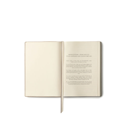- BONAVENTURAのヒストリーが綴られた1stページをはじめ、断面を銀箔で仕上げ、バイカラーのしおりを合わせた特別な商品です。