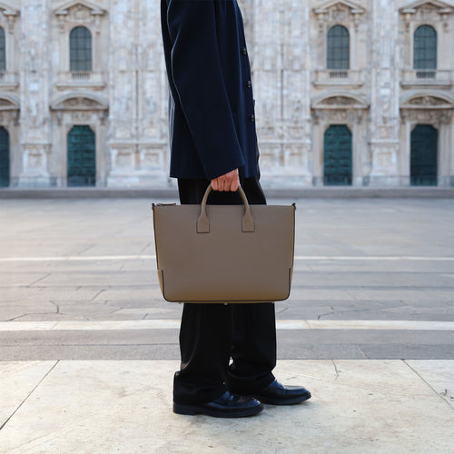 - 上質なシュリンクレザーを使用し、ソフトな印象ながらしっかりと自立する台形フォルムが特徴のブリーフバッグ。