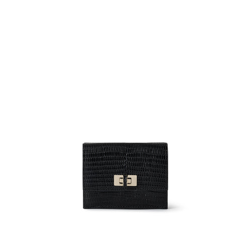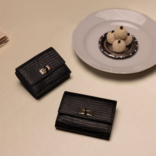 - 落ち着いた艶と美しい陰影が魅力のエンボスリザードレザーを贅沢に使用した三つ折り財布。