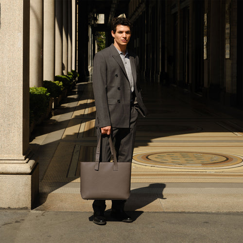 歴史を物語る石畳の路地と、クラシックな建築が連なるイタリアの街並み。ドゥオーモの丸屋根、路地裏に差し込む光、石造りの連なる柔らかなアーチ、歴史を包み込む中庭の曲線、そんな風景からインスピレーションを受けたメタルパーツが、ミニマルでファンクショナルなバッグに輝きを添えます。