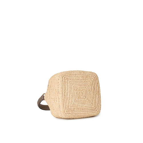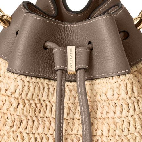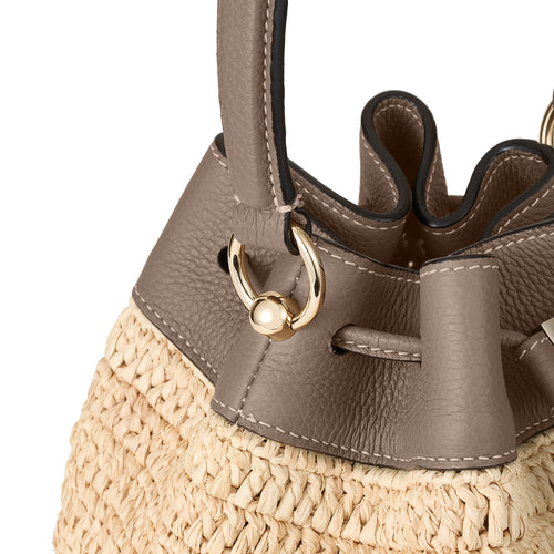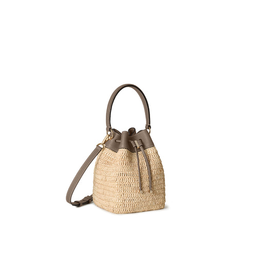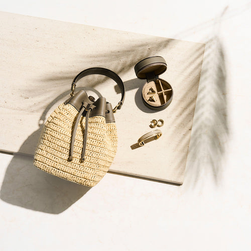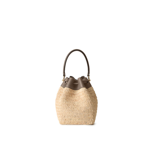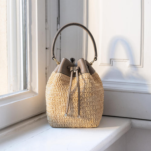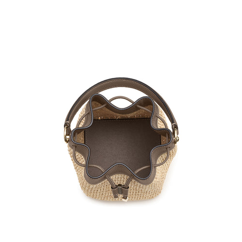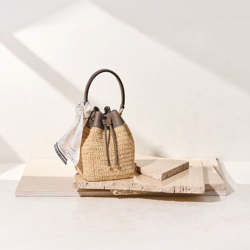- 軽やかさと季節の気配を纏う、ラフィア素材のバケットバッグ。