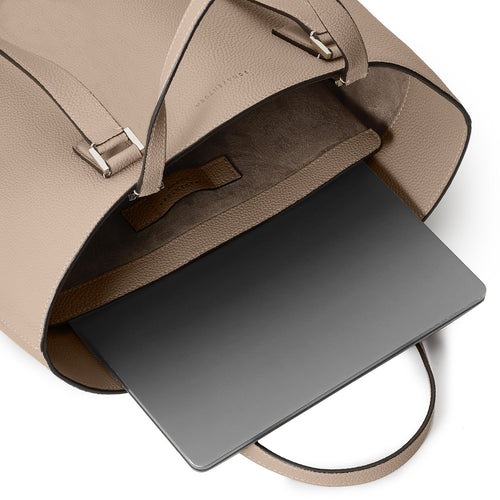 - กระเป๋าโท้ททรงสูงที่ออกแบบมาให้เรียบหรู โดยไม่มีการแบ่งผิวหนังเป็นชิ้น ๆ เพื่อให้สัมผัสถึงความนุ่มนวลของหนังอย่างเต็มที่